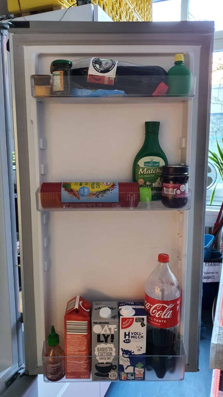 Grundsätzlich gilt: Ist Platz im Kühlschrank dann wird dieser gefüllt. Dies gilt besonders für Getränke die wir den Studierenden anbieten. Zusätzlich sollte immer eine Packung Kuh- und Hafermilch im Kühlschrank sich befinden.